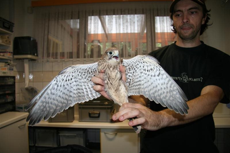 De twee valken zitten nu in onze grote vliegkooi, waar ze kunnen oefenen op het vangen van levende muizen. Normaal gezien kunnen ze snel terug vrijgelaten worden.