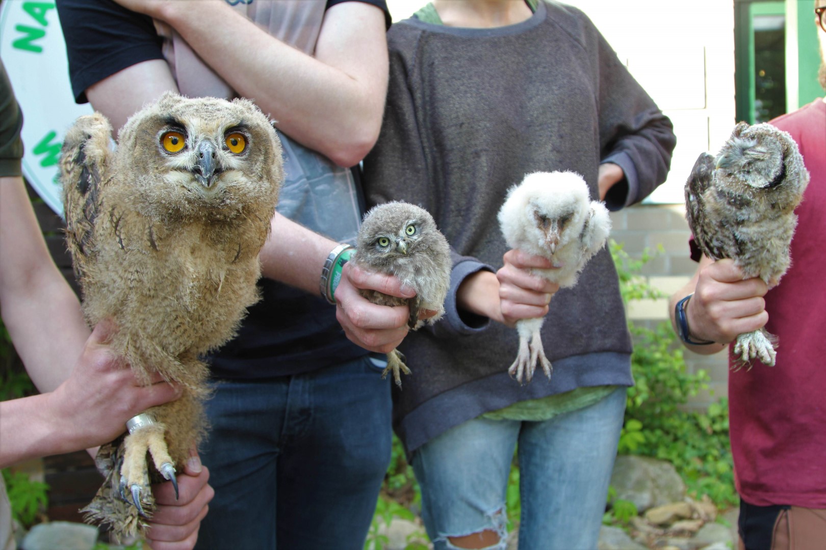 We beginnen links met de grootste van de hoop, de oehoe. Het is onze grootste inheemse uilensoort waarvan de vrouwtjes tot 70cm groot kunnen worden met een spanwijdte van wel 1,80 m. Van nature broedt deze vogel op steile kliffen, in oude steengroeves bijvoorbeeld, of bossen met stevige naaldbomen. Dit kuiken kwam bij ons binnen vanuit Nederlands-Limburg en is momenteel in behandeling voor een pootwonde.