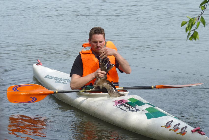 Samen met de melders reden we het natuurgebied in tot aan de viskweekvijver waar we inderdaad een spartelende mannetjeseend aantreffen. De touwen waarin de eend zich vastvloog zijn over de kweekvijvers gespannen om viseters als reigers en aalscholvers van het water weg te houden. Een jammerlijke zaak want geregeld moeten we eenden, reigers, zwanen en zelfs roerdompen uit de touwen redden.