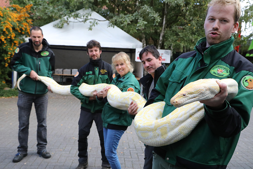 Een alerte politieman meldde dit bij de recherche Leefmilieu. Die namen contact op met de Dienst Dierenwelzijn waarna ze besloten om vandaag terug te gaan naar de eigenaars. Het Natuurhulpcentrum werd daarbij om hulp gevraagd, in de eerste plaats om de reuzenslang veilig te hanteren en in de tweede plaats om voor tijdelijke opvang te zorgen. Het bleek om een reusachtige albino tijgerpython te gaan. De slang was maar liefst 4,5m lang en woog ruim 60kg. De eigenaars hadden het erg moeilijk met de inbeslagname, ze zorgden immers al 20 jaar voor het dier.