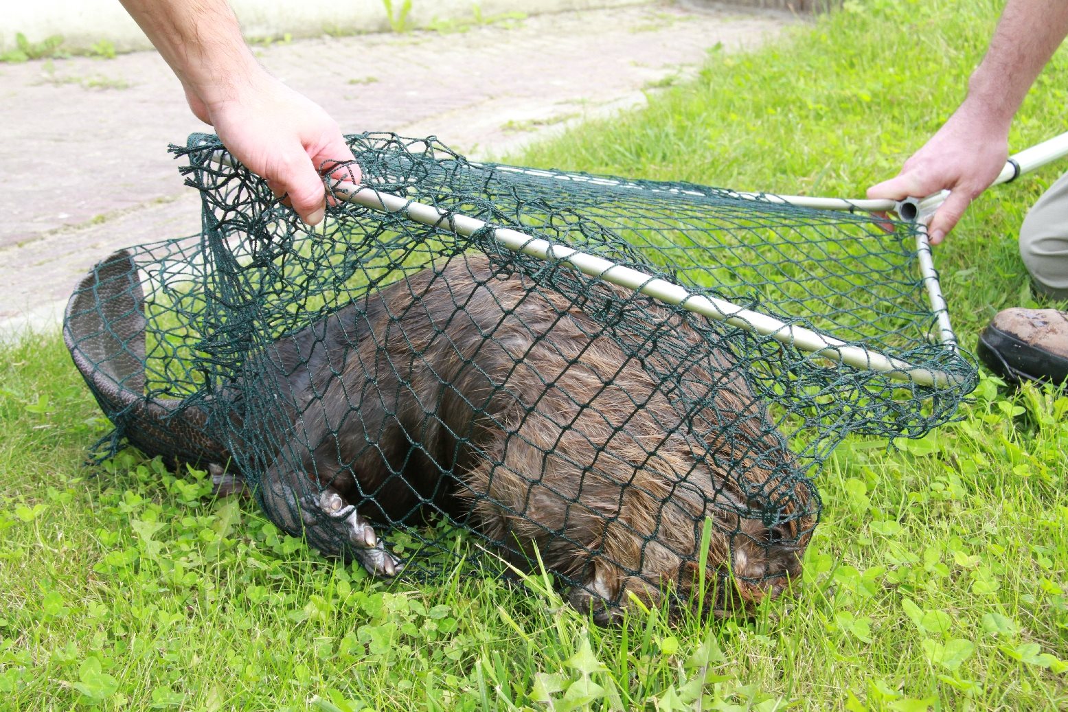 Met drie grote hekken die we vanop een brug in het water lieten zakken, konden we de ingang van de tunnels afsluiten zodat de bever al niet weg kon zwemmen. Enkele medewerkers gingen met een kayak en waadpak het ondiepe water in, en daar lukte het al vrij snel om de bever in de netten te krijgen.