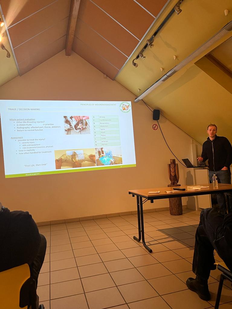 Om bij te leren over de do's en don'ts in de opvang, verzorging, revalidatie en vrijlating van roofvogels en carnivoren gaven onze medewerkers en dierenartsen gedurende drie goed gevulde dagen tekst en uitleg: hoe breng je jonge roofvogels groot? Hoe bereid je dassen het best voor op een vrijlating? Hoe werkt onze muizenkwekerij? Hoe hanteer je een das? Hoe behandel je de zware wondes bij vossen die in een strop terechtkwamen,...Allemaal vragen waarop we een zo duidelijk mogelijk antwoord probeerden te formuleren.
