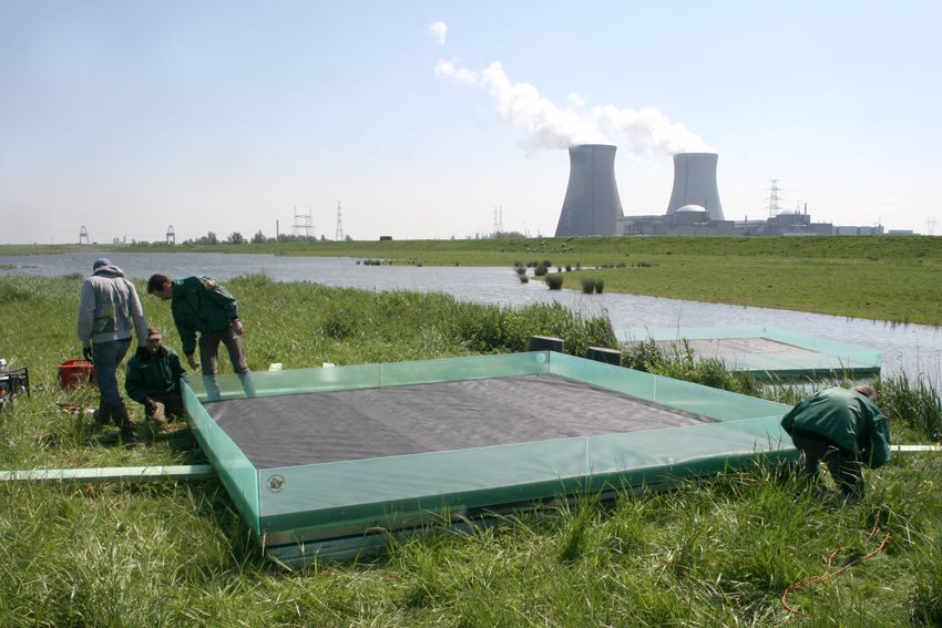 Maandag plaatste het Natuurhulpcentrum 3 grote visdiefvlotjes in de polders rondom de kerncentrale van Doel.
