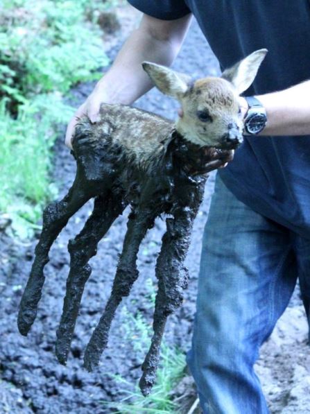 Gisteren moesten medewerkers van het Natuurhulpcentrum een reekalfje redden uit drijfzand in Kelchterhoef.