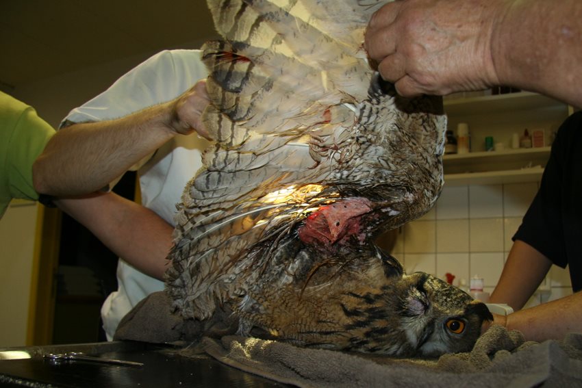Vandaag moesten we naar de oogchirurg met een oehoe. De grote uil werd vorige week uitgeput gevonden in Nederland. De dierenambulance Parkstad haalde de reuze uil afgelopen weekend op. Al snel werd duidelijk waarom deze uil verzwakte. Eén oog vertoonde duidelijke