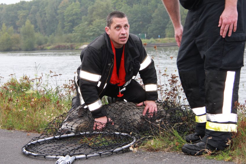 Vrijdagmorgen was het weer 'alle hens aan dek'. Bij de Genkse Brandweer was een oproep binnengekomen dat er maar liefst acht everzwijnen in het kanaal gevallen waren. Door de steile oevers konden de dieren er niet op eigen kracht uit. Wij trommelen Frederik en Bart uit
