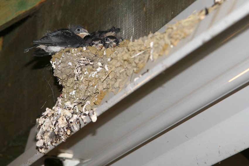 Twee weken geleden hoorden we voor het eerst gepiep uit het nest en beide ouders brengen sinds die dag onophoudelijk insecten en ander voedsel naar hun jongen. We lieten speciaal onze garagedeur dag en nacht openstaan zodat de zwaluwen van 's morgens vroeg tot 's avonds laat in en uit onze garage konden.