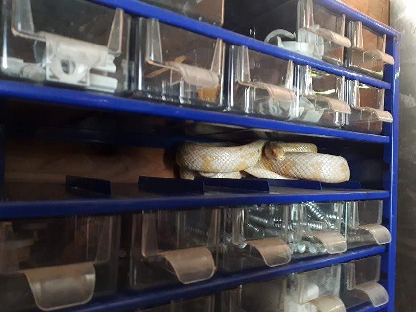 En nee... het ging niet over een tuinslang maar wel om een ontsnapte albino rattenslang. Het reptiel van 80 cm lang had zich verstopt in een schroevenrekje. Toen de eigenaar vanmiddag zijn tuinhuis aan het opruimen was, schrok hij natuurlijk hevig toen hij er een sissende slang aantrof.