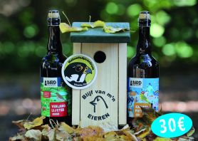 2 Grote flessen van het lekkerste birdbier: de 'verlanglijster' (quadruppel van 9,5%) en de 'kerstmus' (trippel van 8%) + een mezenkast met ludieke opdruk.