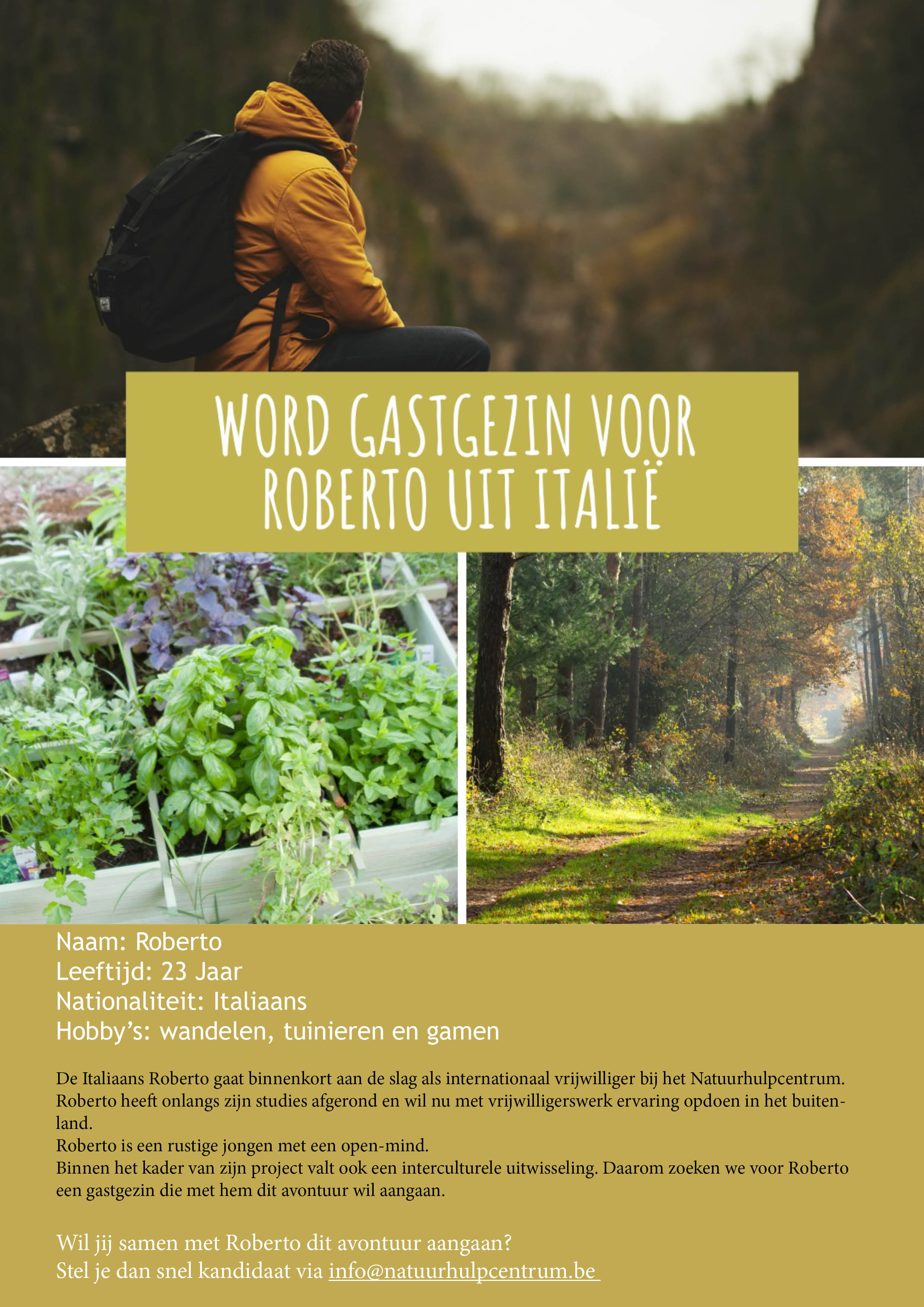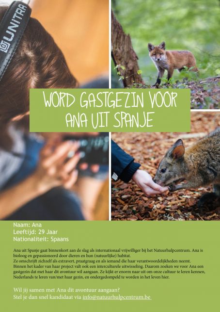 Zie jij het zitten om Ana of Roberto een tijdelijke thuis te geven, en samen met hen een fijn, leerrijk en interessant half jaar mee te maken? Meld je dan zeker aan op info@natuurhulpcentrum.be en we geven je extra informatie over het wel en wee van onze internationale vrijwilligers.