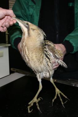Waarschijnlijk is deze roerdomp tegen een hoogspanning, venster of auto gevlogen en heeft hij er een hersenschudding aan overgehouden. Momenteel verblijft het dier nog op onze spoedafdeling, maar we hopen snel op beterschap. Roerdompen zijn een erg zeldzame reigersoort waarvan elk exemplaar meetelt om de populatie in stand te houden. Zeker na een strenge winter zoals die van 2009-2010 hebben vele visetende dieren het erg moeilijk gehad.