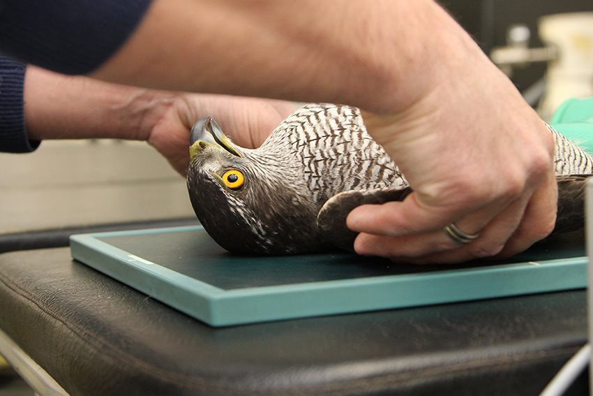 De vogel huppelde rond op de parking en liet een vleugel afhangen. Om te voorkomen dat de vogel zou weg zijn voor onze medewerkers aankwamen, werd er een doos over de vogel gezet. Op die manier kan je veilig een roofvogel tijdelijk 'opsluiten'. Twee medewerkers gingen ter plaatse om de vogel op te halen. Ze troffen onder de doos een gewonde havik aan.