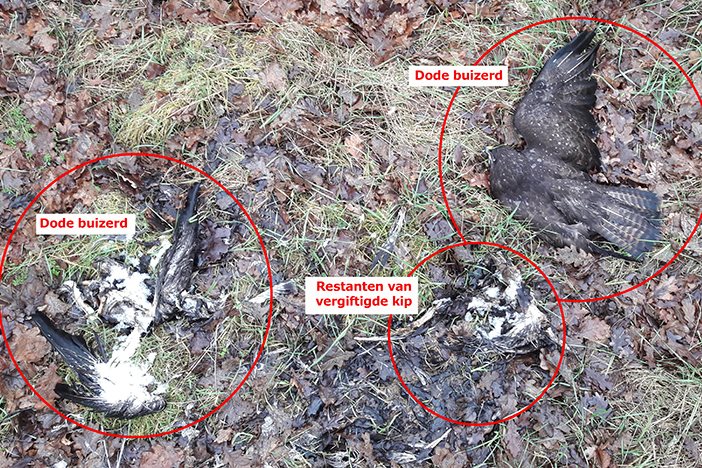 Het begon met de melding van drie dode buizerds. Toen een medewerker ter plaatse ging kijken, werden twee buizerdkadavers en een kippenkadaver aangetroffen. De drie kadavers lagen op amper 1m². Bij een van de buizerds zat het vergiftigde vlees nog in zijn bek. Het gif was dus dermate sterk dat de roofvogel na enkele happen al dood neer viel.