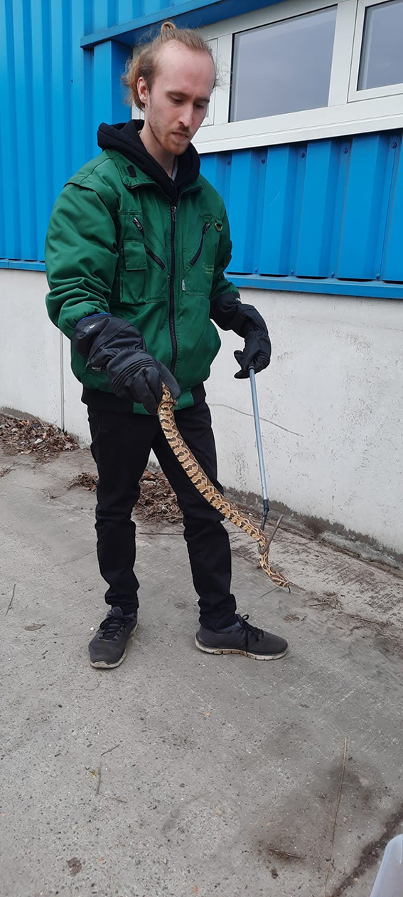 Twee medewerkers gingen ter plaatse. Gelukkig was de slang nog niet ontsnapt en slaagden ze erin het dier op een veilige manier te vangen. Ons vermoeden bleek juist want het gaat om een Palestijnse adder (Daboia palaestinae), een giftige slang uit het Midden-Oosten. De soort staat bekend om zijn agressief gedrag en in het land van herkomst zijn de meeste slangenbeten aan deze soort te wijten.