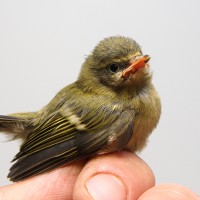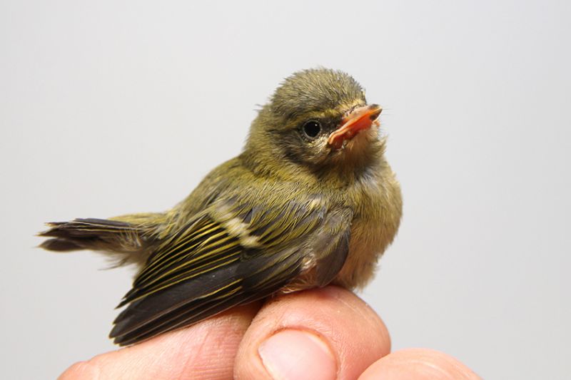 * De jonge vogel maakt geen aanstalte om te vliegen of bewegen.