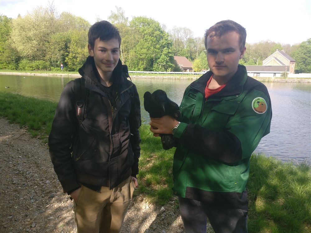 De 2e stop was Zonhoven om vogels uit een schouw te redden. Elk jaar hebben we een hele resem van zulke interventies: de vogels zijn op zoek naar een goede nestholte en tuimelen dan per ongeluk in de schoorsteenpijp. Een simpel ijzeren roostertje kan al veel leed voorkomen! Dit desbetreffende dak was makkelijk te beklimmen en met de nodige voorzichtigheid konden we 2 kauwen uit de schouw vissen. Nog vlug een roostertje op de schouwopening en klaar is kees! De kauwen kwamen mee naar het Natuurhulpcentrum voor verdere verzorging.