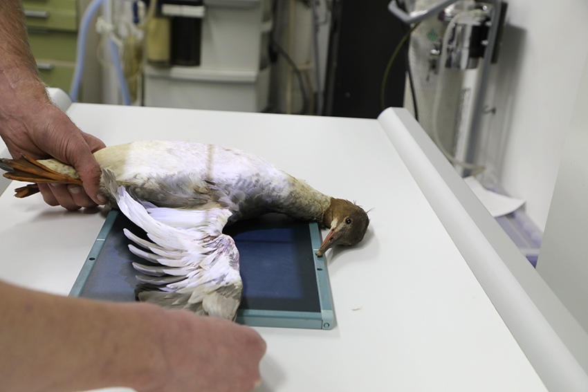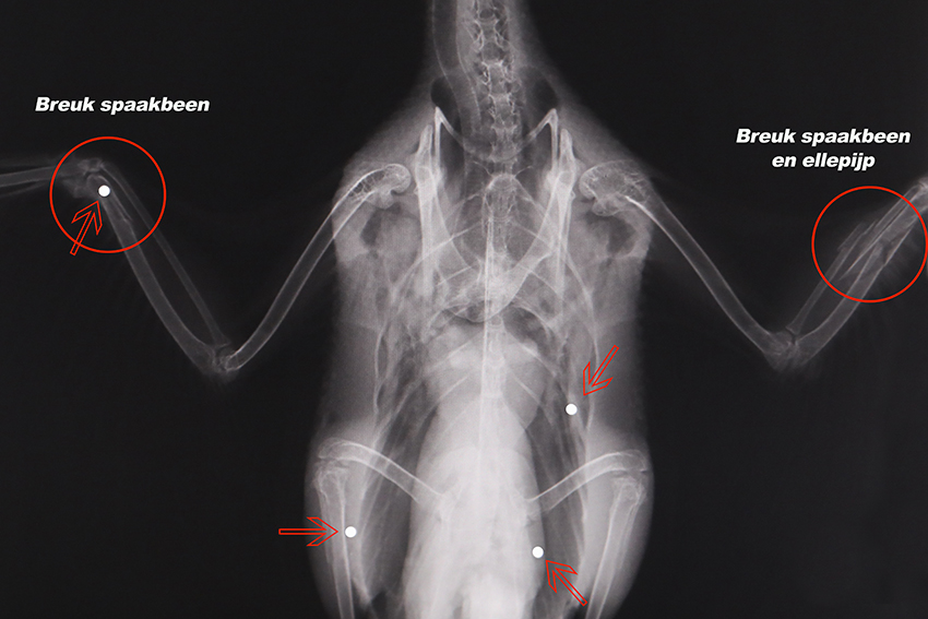 De zoektocht naar de geschoten zaagbek was succesvol. Er werd een vrouwelijke vogel terug gevonden. De röntgenfoto die in het Natuurhulpcentrum werd gemaakt is duidelijk: de vogel zit vol met hagelbolletjes. Twee gebroken vleugels en een gebroken poot was het verdict. De zaagbek wordt ondertussen gestabiliseerd en de dierenartsen bekijken momenteel de mogelijkheden tot operatie, maar de verwondingen zijn bijzonder ernstig.