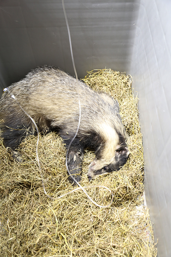 Twee wandelaars betrapten gisteren in Alken een man die een jong dasje aan het neerknuppelen was. Toen een van de wandelaars een foto van de man nam, stopte hij onmiddellijk en nam hij de benen. De politie werd gebeld en via ARS (Animal Rescue Service) geraakte de zwaar gewonde das in het Natuurhulpcentrum. Momenteel is hij stabiel maar echt beterschap is er voorlopig niet. Het dasje incasseerde dan ook enorm zware klappen. Onze dierenarts constateerde bloeduitstortingen op de rug en schaafwonden rond de mond. Mogelijk heeft het dier ook hersenschade overgehouden aan de afranseling.