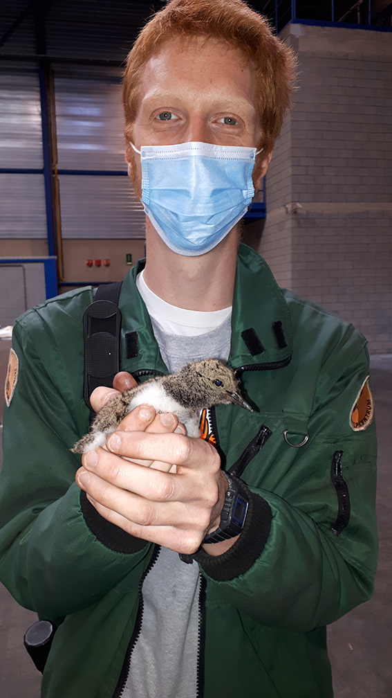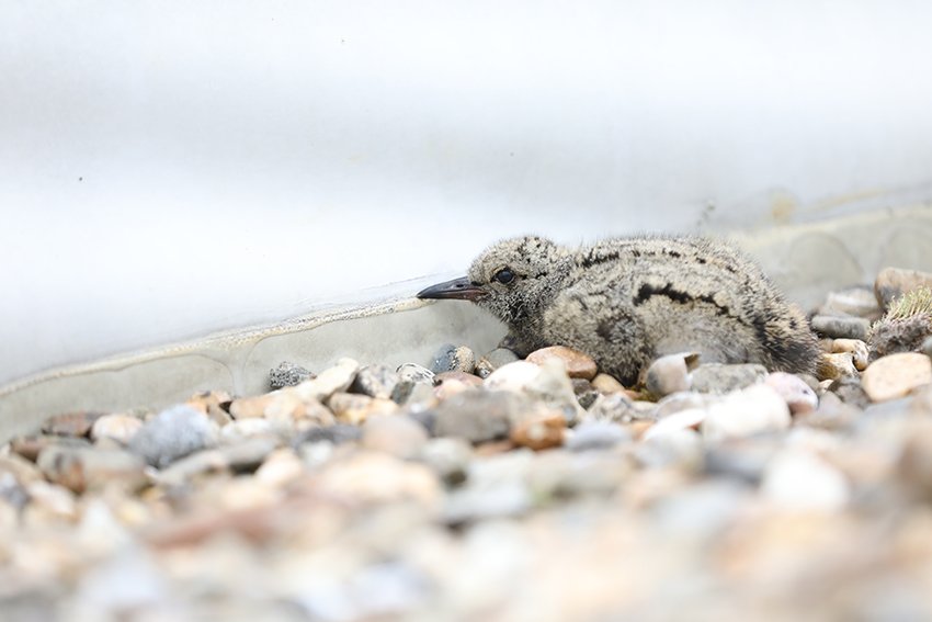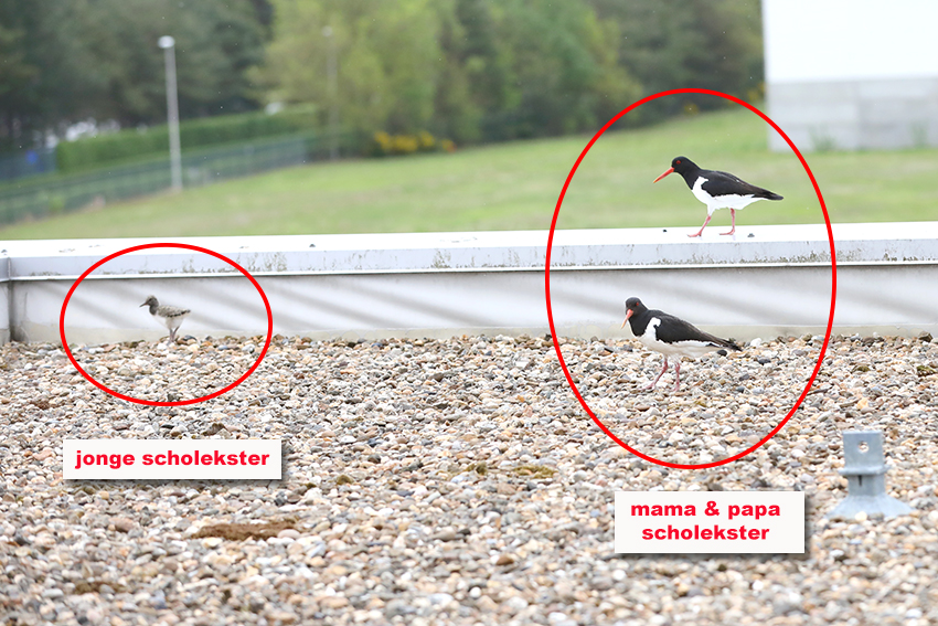 Via een luik in het dak konden onze medewerkers het kiezeldak bereiken. Scholeksters broeden normaal op kiezelstrandjes en een plat dak lijkt daar natuurlijk erg op. Eenmaal het dak bereikt begonnen zowel ouders als jong luidkeels te piepen. Het was dan ook een hartelijk weerzien!