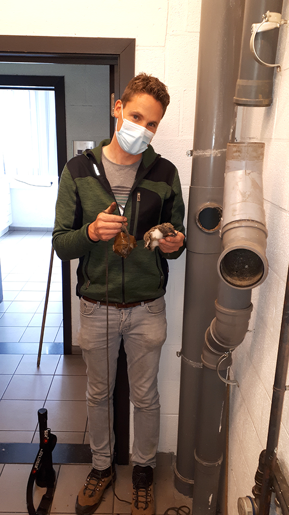 Twee medewerkers stonden voor een moeilijke opdracht. Het vogeltje was vanop het dak 15m lager door de buis gevallen en zat nu onder de betonvloer te piepen. Nadat er een zijdelingse buis kon losgemaakt worden, werd het gepiep luider en luider. Toch geraakten onze mensen met hun arm niet in de buis. Ze besloten dezelfde techniek te gebruiken als bij een vogel in de schouw: een kleverige strip laten zakken.