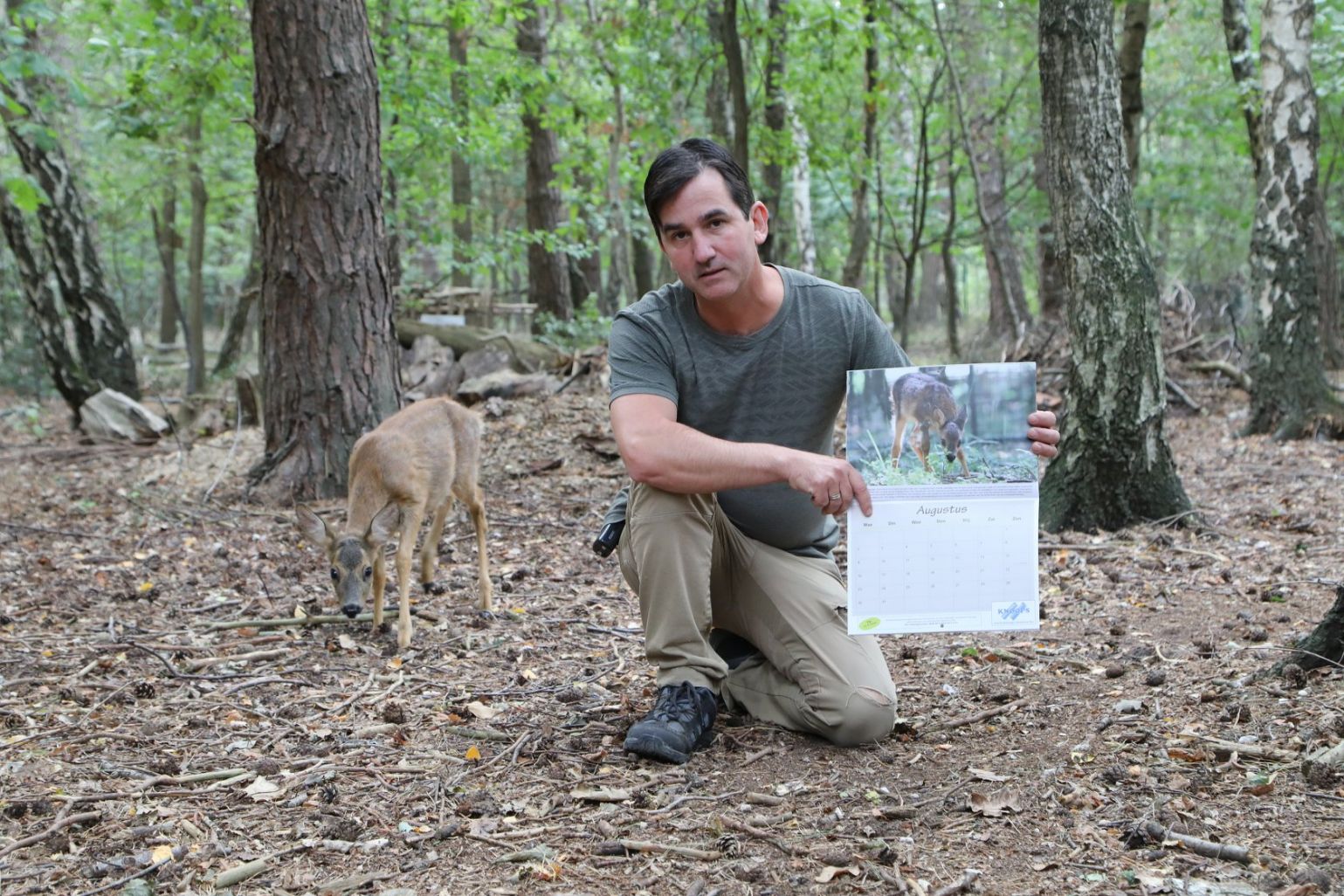 In augustus staat het ree centraal. Jonge reeën zijn dan al enkele maanden oud en beginnen de wereld te ontdekken. Bart (foto) ontfermt zich jaarlijks over de jonge reeën die worden binnengebracht. Met veel liefde en geduld slaagt hij erin om de jonge reeën te laten opgroeien tot mooie, gezonde dieren. Deze foto toont één van de jonge reeën in het uitwenbos. Het dier komt nieuwsgierig kijken naar een foto van hemzelf in onze kalender :-)