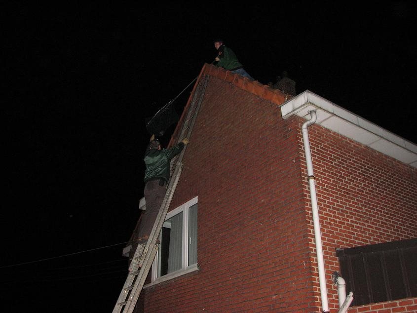 Eén van de medewerkers klom met een vangnet op de nok van het dak, terwijl een andere vanuit de zolder zachtjes de pannen optilde waartussen de kauw klem zat. Toen deze loskwam kon hij vanop het dak gevangen worden.