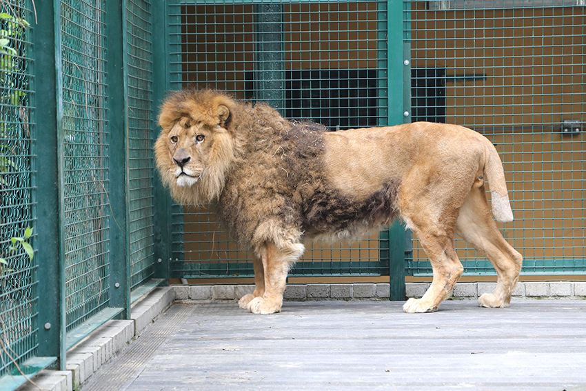 Een normale quarantaineperiode voor leeuwen duurt één maand, maar omdat de staart van Mao extra verzorging nodig had, bleef het leeuwenduo wat langer in onze quarantainekooien. Mao was er bij aankomst het ergst aan toe. Zijn manen zaten vol klitten en modder, hij zakte door zijn achterpoten en hij had een lelijke wonde aan zijn staart. Tijdens de quarantaineperiode slaagden we erin Mao op te knappen, alleen zijn staart had wat meer tijd en verzorging nodig.