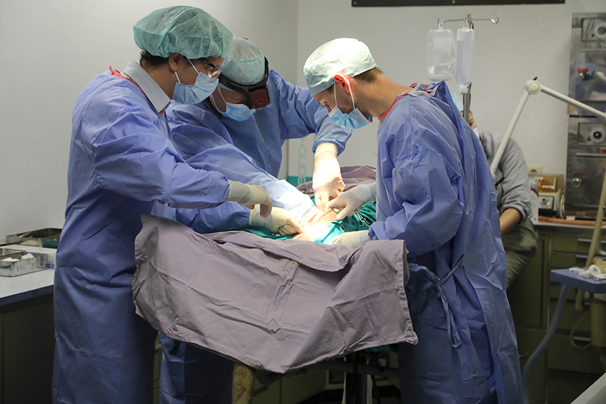 Om de situatie juist in te kunnen schatten, werd er beslist om Mia vandaag te opereren. Een medisch team werd samengesteld: Stef en Matty (onze dierenartsen van DAC-assist), Frauke Ramakers (anesthesiste) en Evert-Jan Boerma (buikchirurg menselijke geneeskunde) om de operatie uit te voeren. Voor onze dierenverzorgers was het bang afwachten, want afhankelijk van wat de artsen zouden aantreffen in Mia's buik, zou er geopereerd worden of besloten worden tot euthanasie.