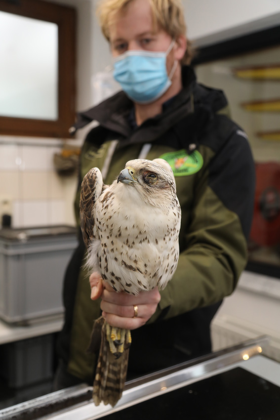 De valk verblijft momenteel ter observatie op onze afdeling intensieve zorgen en doorloopt het protocol voor verzwakte roofvogels. Hij kreeg een warm verblijf, er wordt vocht toegediend en hij krijgt licht verteerbare voeding.