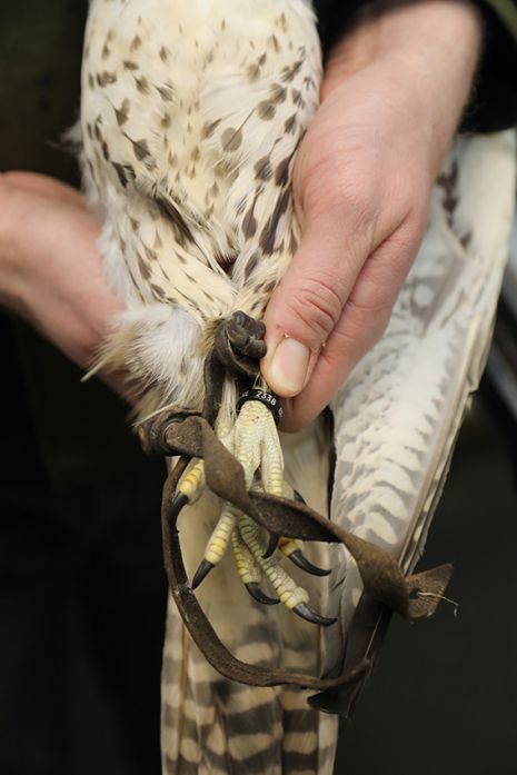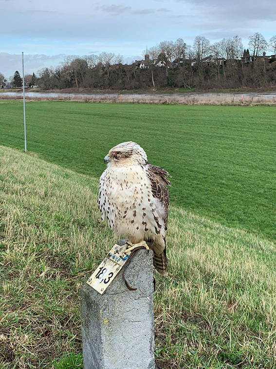 De vogel is waarschijnlijk een sakervalk of een kruising van verschillende valkensoorten. Roofvogelkwekers proberen door het kruisen van slecht-, saker-, gier- en lannervalken de beste eigenschappen van elke soort te bundelen tot de 'ultieme' valk (die dan voor veel geld verkocht kan worden). Hierdoor is het vaak onduidelijk om welke soort het juist gaat. Ondertussen proberen we de eigenaar op te sporen. De vogel draagt een Nederlandse ring maar helaas bestaat er geen centrale databank voor dergelijke vogels...