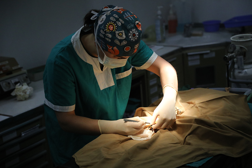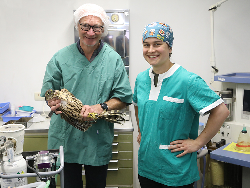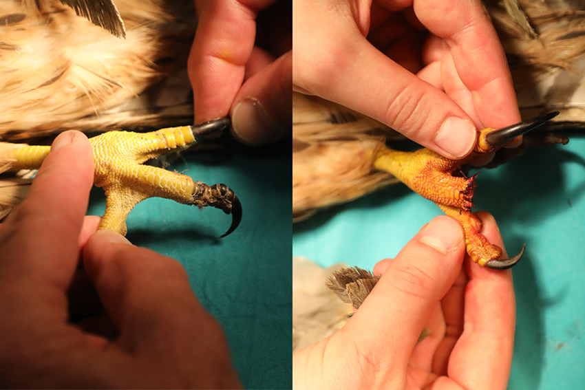 Een nazicht door onze dierenarts wees uit dat één teen ernstig verwond was en mogelijk niet gered zou kunnen worden. De pezen waarmee de teen kan bewegen, waren helemaal doorgesneden en een operatie drong zich op. Vrijwilligster Katrien, een pas afgestudeerde dierenartse, mocht onder begeleiding van Stef (oude rot in het vak :-) de amputatie uitvoeren. Het zou haar eerste operatie worden van een wild dier in het Natuurhulpcentrum.