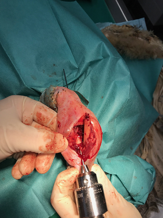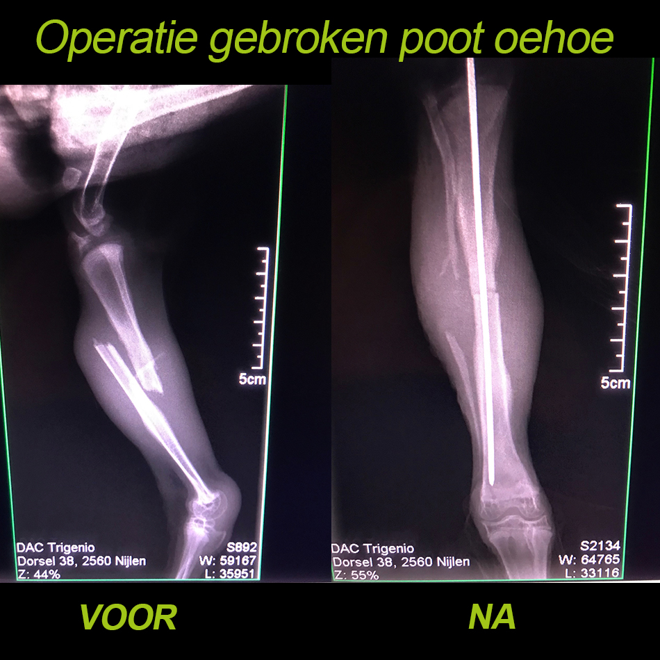 De moeilijkheid bij deze operatie was het herstelproces dat reeds in gang was getreden. Daardoor waren beide delen van het scheenbeen reeds gedeeltelijk aan elkaar gegroeid. Dierenarts Tom slaagde er echter in de moeilijke klus te klaren en kon middels een metalen pin alles mooi op zijn plaats krijgen. Ondertussen verblijft de oehoe op onze afdeling intensieve zorgen en stelt hij het goed. Bij jonge vogels verloopt het herstel van breuken over het algemeen sneller en we verwachten dat de metalen pin over 3 weken verwijderd kan worden. Daarna begint het verdere revalidatieproces in onze binnen- en buitenkooien voor roofvogels.