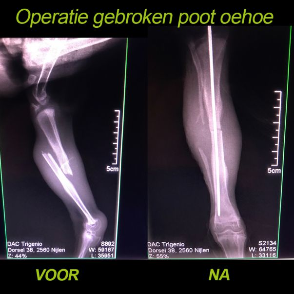 Er werden eerst röntgenfoto's gemaakt om de ernst van de breuk te bepalen. Het scheenbeen van de vogel was duidelijk gebroken en de twee helften stonden naast elkaar. Dit was een breuk die niet extern gespalkt kon worden en een operatie drong zich op. Dierenarts Tom Verbeek werd bereid gevonden om de oehoe te opereren.