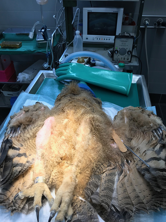 Begin deze week werd een jonge oehoe met een gebroken poot door dierenarts Tom geopereerd. Het was een Nederlandse oehoeonderzoekster die aan de alarmbel trok.