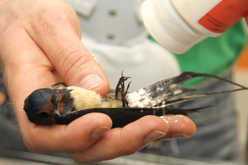 Zo kregen we een telefoontje uit Zoutleeuw met de melding dat een boerenzwaluw in een vliegenvanger was gevlogen. Het vogeltje zat onder de lijm en kon niet meer vliegen. Gelukkig werd de melder bereid gevonden om het diertje naar Opglabbeek te brengen. Omdat de zwaluw enkel op één vleugel en een stuk van de staart kleefsel had, besloten we het diertje onmiddellijk te reinigen. Dit gebeurt met speciaal biologisch oplosmiddel. Na een kwartiertje poetsen waren de meeste lijmresten verdwenen en werden de laatste kleverige plekjes geneutraliseerd met talkpoeder.