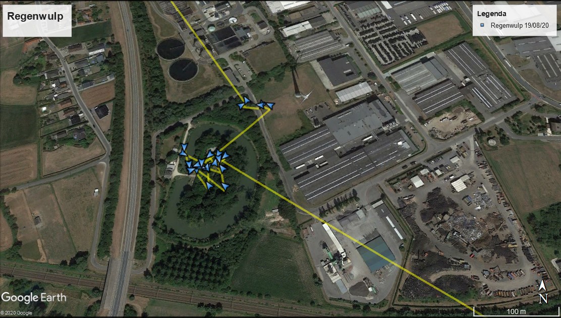 Maar vorige week, in de nacht van 15 op 16 augustus, vertrok de vogel plots. De eerste nacht vloog hij in één ruk door, en stopte pas met vliegen tot ongeveer 10u ’s morgens! Vervolgens hield hij een kleine pauze om de volgende nacht helemaal tot aan de luchthaven in Zaventem te vliegen. Toevallig of niet maar hier werd hij enkele maanden voordien in beslag genomen. De cirkel leek rond te zijn, maar nadat hij hier uitgerust had vertrok hij om 3 uur ’s nachts richting Dendermonde, waar hij rond 9 uur ’s morgens toekwam ter hoogte van fort Driebek, een kleine groene oase langs een groot industrieterrein. Hier zien we nogmaals het nut van kleine groene zones die als zogenaamde stapstenen van levensbelang zijn voor de migratie van allerhande dieren. Na wat bijtanken vloog hij op 18 augustus de Nederlandse grens over tot in Cadzand. Daarna volgde hij de Westerschelde iets meer inlands tot in Terneuzen waar hij 19 augustus aankwam. Of dit het begin is van een lange tocht, of dat dit al zijn eindpunt is, zullen we in de komende weken en maanden zien. Word vervolgd!