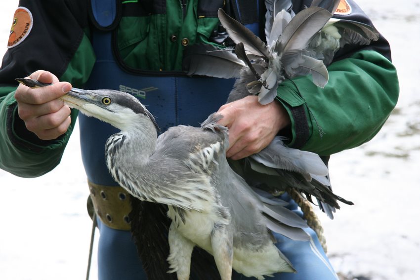 Deze week moesten we naar Zonhoven om een reiger te redden die verstrikt was geraakt. Het dier zat vast aan een kabel die over een visvijver was gespannen.