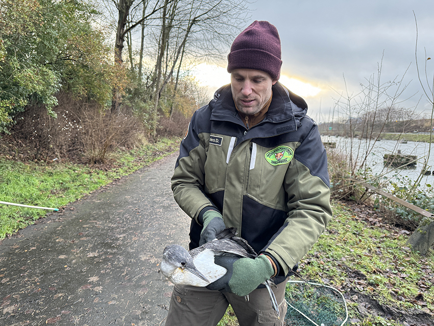 Begin deze week werden we gecontacteerd door een oplettende vogelspotter. Hij zag in het weekend in Lanaken een roodkeelduiker in de problemen zitten. Het dier had een stuk net rond zijn bek en nek. De vogel was versuft en dook ook niet meer normaal weg.