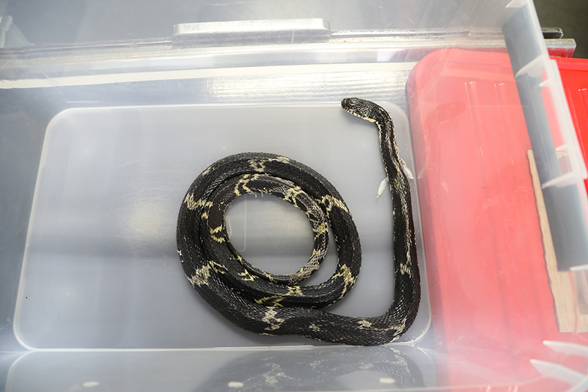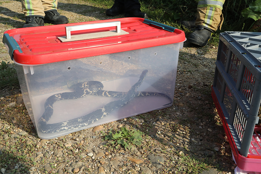 Onze medewerkers konden de Russische rattenslang met een slangenhaak in veiligheid brengen. Het dier was erg mager, onvolledig verveld en had een wonde aan de buik. Het lijkt erop dat de slang al enige tijd overleefde in het gebied. Russische rattenslangen staan er voor bekend om ook in onze contreien te kunnen gedijen. Zo is er in Nederland een populatie van ontsnapte exemplaren die al ettelijke jaren overleeft.