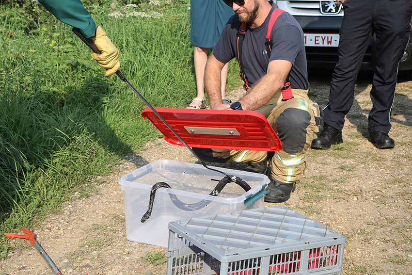 Ze had een plaatselijke jachtwachter die langsreed gevraagd haar te helpen, maar die weigerde en liet de vrouw achter met de slang. Nadat ze ons een foto had gestuurd, werd duidelijk dat het geen inheemse slang was. Twee medewerkers vertrokken onmiddellijk om het reptiel te vangen. Omdat de slang open en bloot op een wandelpad lag te zonnen, vreesden we echter dat het dier verdwenen zou zijn wanneer onze ploeg toekwam. Daarom werd de Tongerse brandweer ook ter plaatse gestuurd. In tussentijd was de moedige dame er echter in geslaagd de slang, van 1 m lang, te vangen onder een winkelkrat.