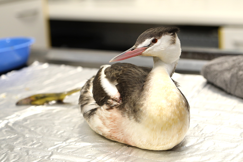 De vogel had zich ondertussen toch weten los te wrikken en strompelde uitgeput over het ijs. Onze medewerker kon het onderkoelde dier met een schepnet vangen. Eenmaal terug aan wal, bleek de vogel een wonde aan zijn poot te hebben. Waarschijnlijk heeft de fuut daardoor vannacht te lang stil gezeten op het ijs en is hij vervolgens vastgevroren.