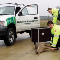* Leg het gewonde dier in een kartonnen doos of winkelbak in uw koffer. Bij grote dieren zoals reeën, everzwijnen,... mag u altijd contact met ons opnemen via 089/854906.