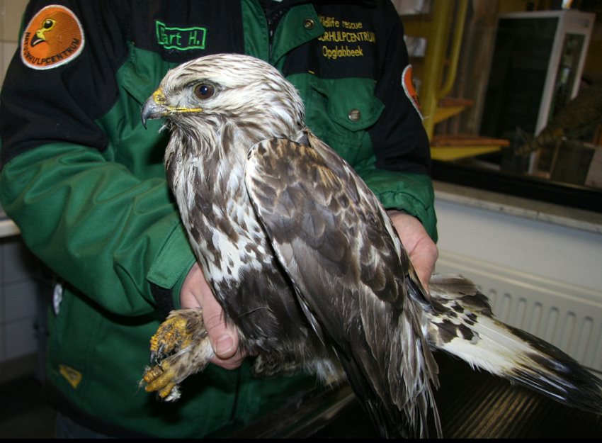 Momenteel verblijft de ruigpootbuizerd op onze spoedafdeling en krijgt hij dezelfde behandeling als alle andere verzwakte roofvogels. Zo wordt er geregeld vocht onderhuids toegediend en krijgt hij driemaal daags verse stukjes muis te eten. De ruigpootbuizerd lijkt goed op onze behandeling te reageren want vanmorgen had het dier al zelf gegeten en stond terug recht op de poten.