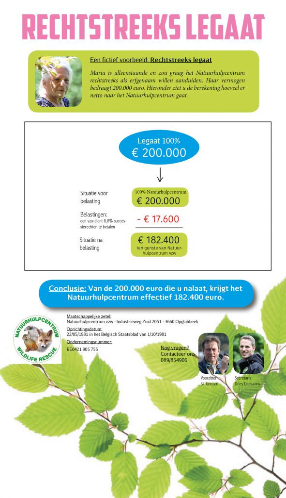 De techniek van het duo-legaat was het geknipte middel om ervoor te zorgen dat uw erfgenamen uiteindelijk netto meer overhouden van uw erfenis. U hoefde alleen maar een goed doel, zoals het Natuurhulpcentrum vzw, mee op te nemen in uw testament.