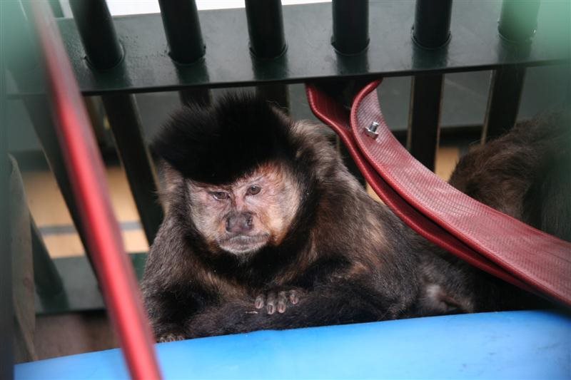 Gisteren haalde een medewerker vijf capucijnapen op uit de Universiteit van Namen. De jongen van deze apen zouden getraind worden om mensen met een handicap te helpen: microgolfoven bedienen, CD's insteken, dingen aangeven,... Dit project bleek echter veel te kostelijk, waardoor het afgebroken moest worden. In de jaren hierna deden studenten gedragsonderzoek op de apen, maar nu, tien jaar later, moesten Jane, Lola, Lustucru, Chacha en Louise weg. Een hele aanpassing voor de dieren. Sommige zijn al 28 jaar oud!