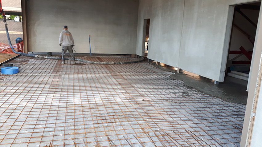 Verder was vandaag ook een speciale dag om 2 redenen. Ten eerste kwam sponsor Industrievloeren Jos Eerdekens voor de eerste keer in actie voor onze uitbreiding. Een ploeg van hen stortte vandaag de druklaag op het gelijkvloers van ons nieuwe gebouw.
