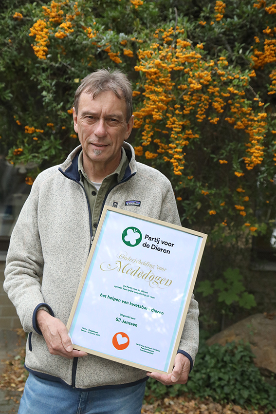 Ten tweede ontving onze voorzitter Sil een mooie 'onderscheiding voor mededogen' van de Nederlandse Partij voor de Dieren. Zij zijn Sil en het Natuurhulpcentrum bijzonder erkentelijk voor de jaarlijkse opvang en verzorging van meer dan 2.500 wilde dieren in nood vanuit de provincie Nederlands Limburg. "Deze onderscheiding is niet alleen voor mij" verklaart Sil, "ik draag deze erkenning op aan al mijn personeelsleden en vooral de vrijwilligers die zich dag en nacht inzetten!"