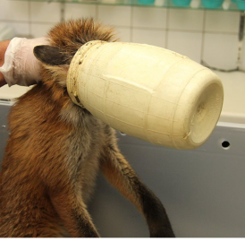 * Zet een gewond wild dier steeds in een donkere doos, een wasmand of vogelkooi met een handdoek erover. Zorg wel voor luchtgaatjes.