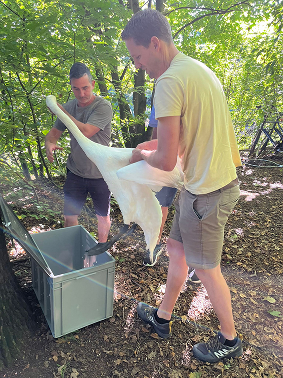 Voor de zekerheid werd 'Pappie' nog enkele dagen ter observatie op onze revalidatievijver gezet. Toen bleek dat zijn stoelgang in orde was en hij goed zwom, brak een belangrijk moment aan. Samen met Martin en Chrisje gingen we het zwanengezin zoeken zodat 'Pappie' terug herenigd kon worden. Een tafereel dat de beide zwanenliefhebbers duidelijk emotioneerde en ook 'Pappie' knuffelde al snel met zijn vrouwtje en kinderen. Eind goed, al goed dus...