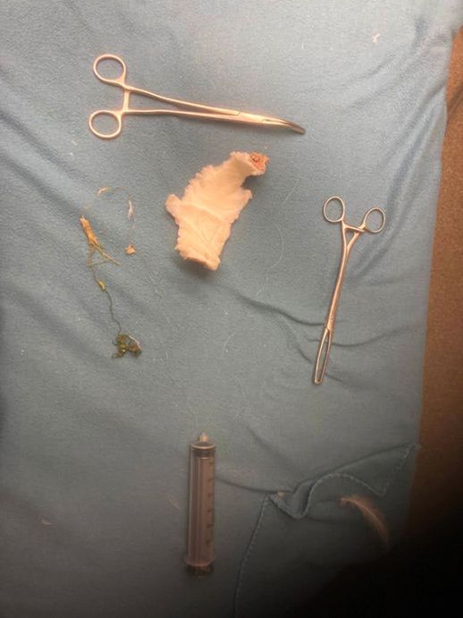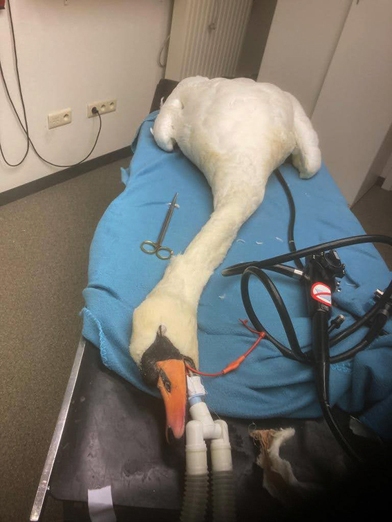 Helaas kon zwaan 'Pappie' niet ter plaatse bevrijd worden van het vistuig en moest hij mee naar Opglabbeek. Eerst werd er tijdens een röntgenonderzoek gezocht naar een haak, lood of een dobber. Toen die niet gevonden werden, besloot de dierenarts om via een endoscopie in de maag te kijken. De visdraad bleek in de maag van de vogel rond plantenmateriaal gewikkeld te zitten. Via de endoscopie kon gelukkig alles verwijderd worden.